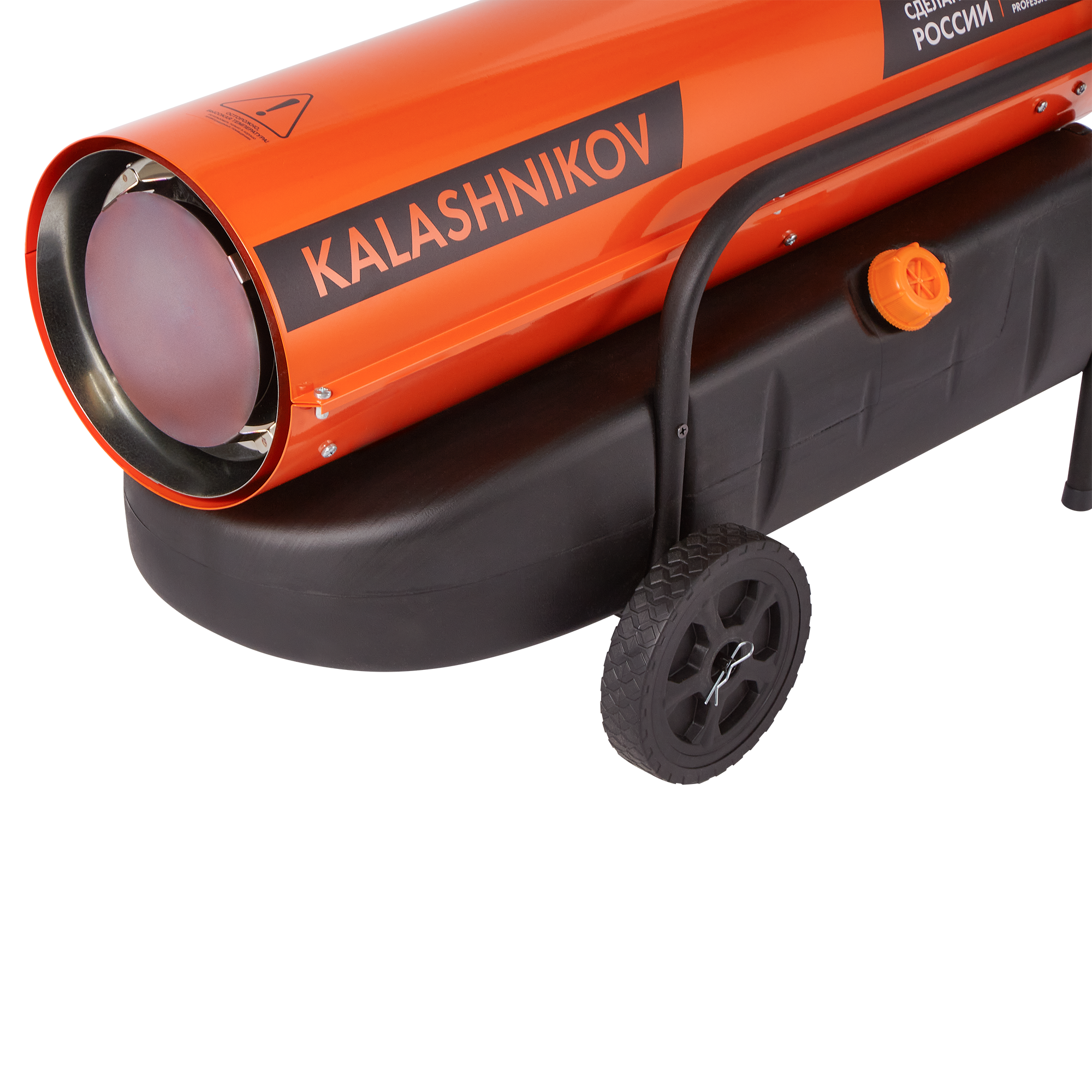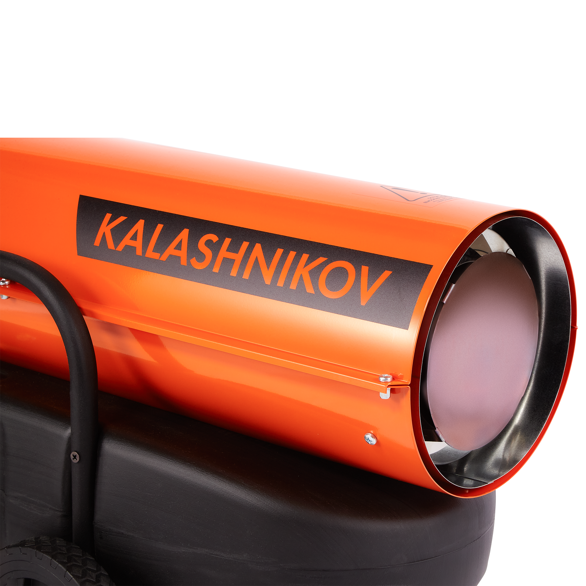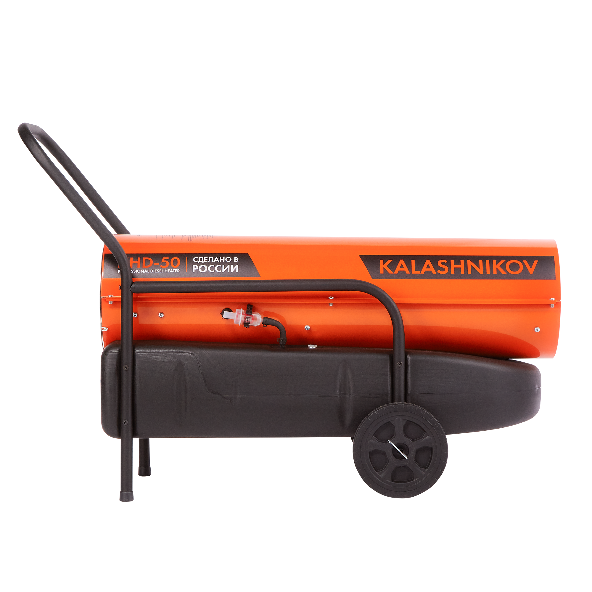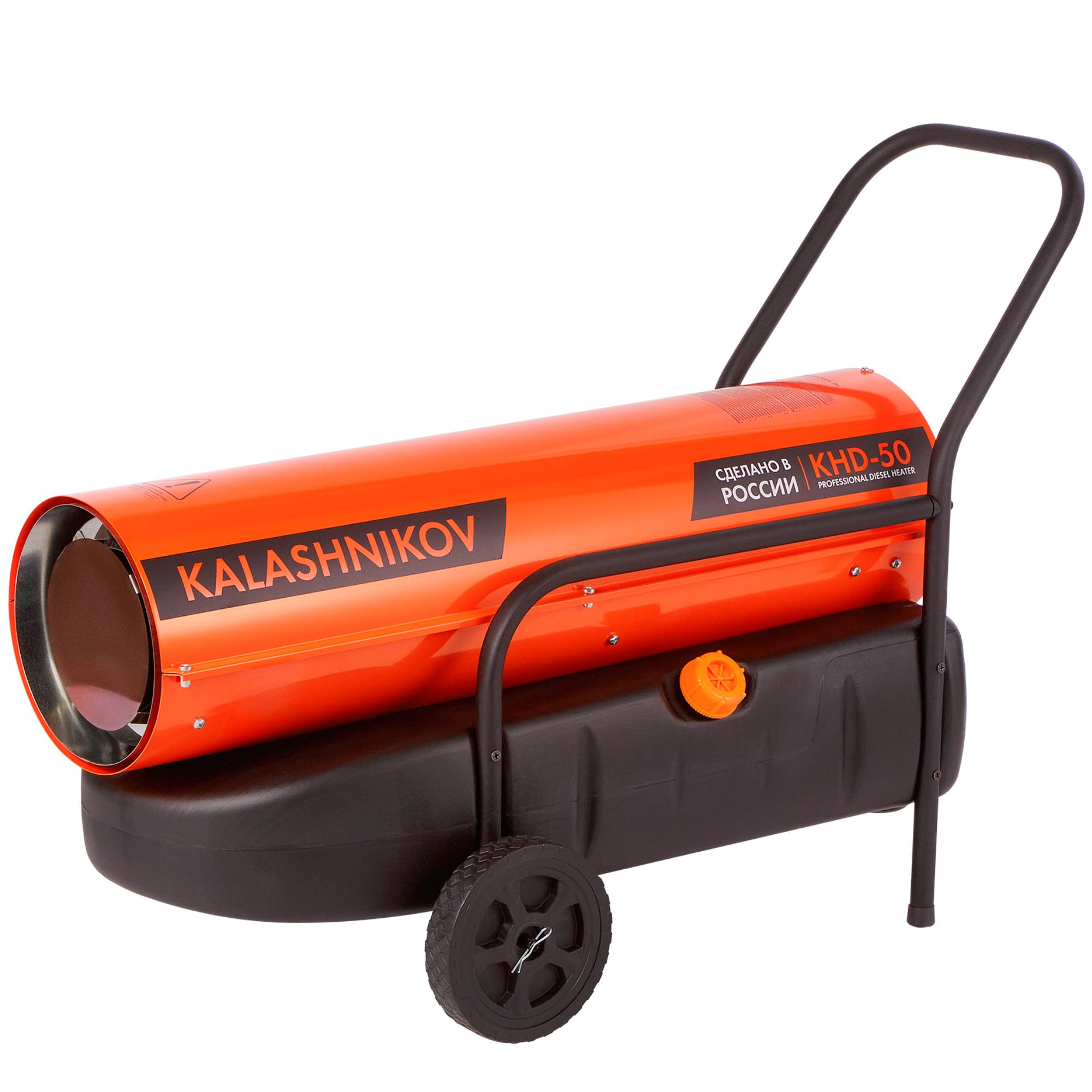 Дизельная тепловая пушка KALASHNIKOV KHD-50 – это мощный обогреватель, работающий на дизельном топливе. Высокий уровень КПД прибора близок к 100%, а тепловая мощность 50 кВт, производимая тепловой пушкой – вполне достаточна для использования устройства в качестве мощного генератора тепла.