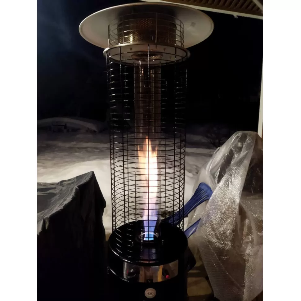 Уличный газовый обогреватель для террасы WWT 13D PRO Black mini выполнен в форме колбы, оканчивающейся алюминиевым отражателем. Нижняя его половина закрытая, а верхняя представляет из себя прозрачную трубку из огнеупорного стекла, внутри которой горит пламя. Такой дизайн выглядит привлекательно сам по себе, а в сумерках он еще и создает особую, романтическую атмосферу.