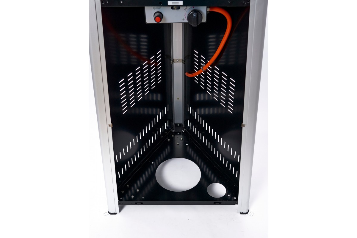 Закрытая нижняя часть обогревателя выполнена и высококачественной стали и покрыта порошковой краской. Верх прибора – это стальной каркас с гранями, заполненный металлическими фасадами с продольной перфорацией, что делает стенки практически прозрачными. Внутри этой части помещена колба из прочного закаленного термостойкого стекла, по которой от топливного баллона вверх поднимается сжиженный газ (пропан-бутан). При активировании электро-пьезоподжига газ загорается, и в колбе появляется живое пламя, источающее инфракрасное тепло и мягкий свет. Попадая на шляпку-редуктор, тепловые лучи рассеиваются в окружающее пространство, нагревая предметы.