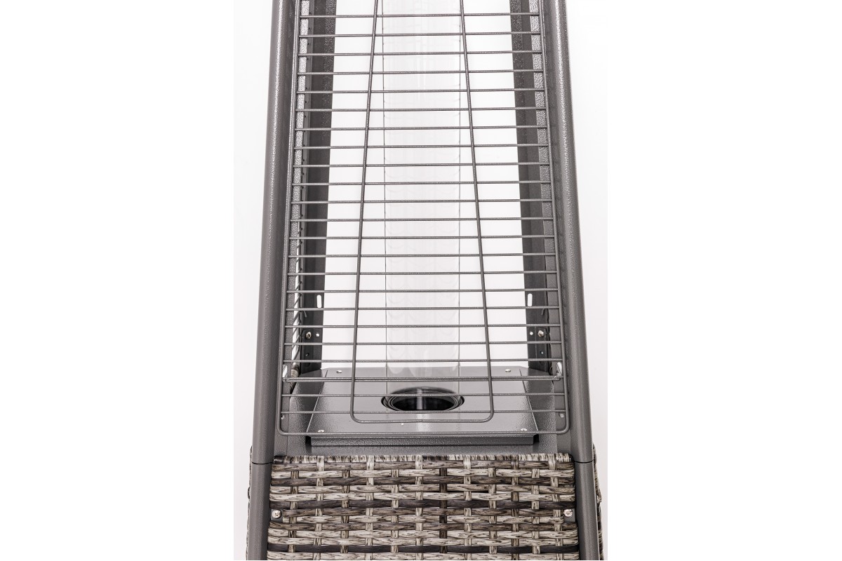 Закрытая нижняя часть обогревателя выполнена и высококачественной стали и покрыта порошковой краской. Верх прибора – это стальной каркас с гранями, заполненный металлическими фасадами с продольной перфорацией, что делает стенки практически прозрачными. Внутри этой части помещена колба из прочного закаленного термостойкого стекла, по которой от топливного баллона вверх поднимается сжиженный газ (пропан-бутан). При активировании электро-пьезоподжига газ загорается, и в колбе появляется живое пламя, источающее инфракрасное тепло и мягкий свет. Попадая на шляпку-редуктор, тепловые лучи рассеиваются в окружающее пространство, нагревая предметы.