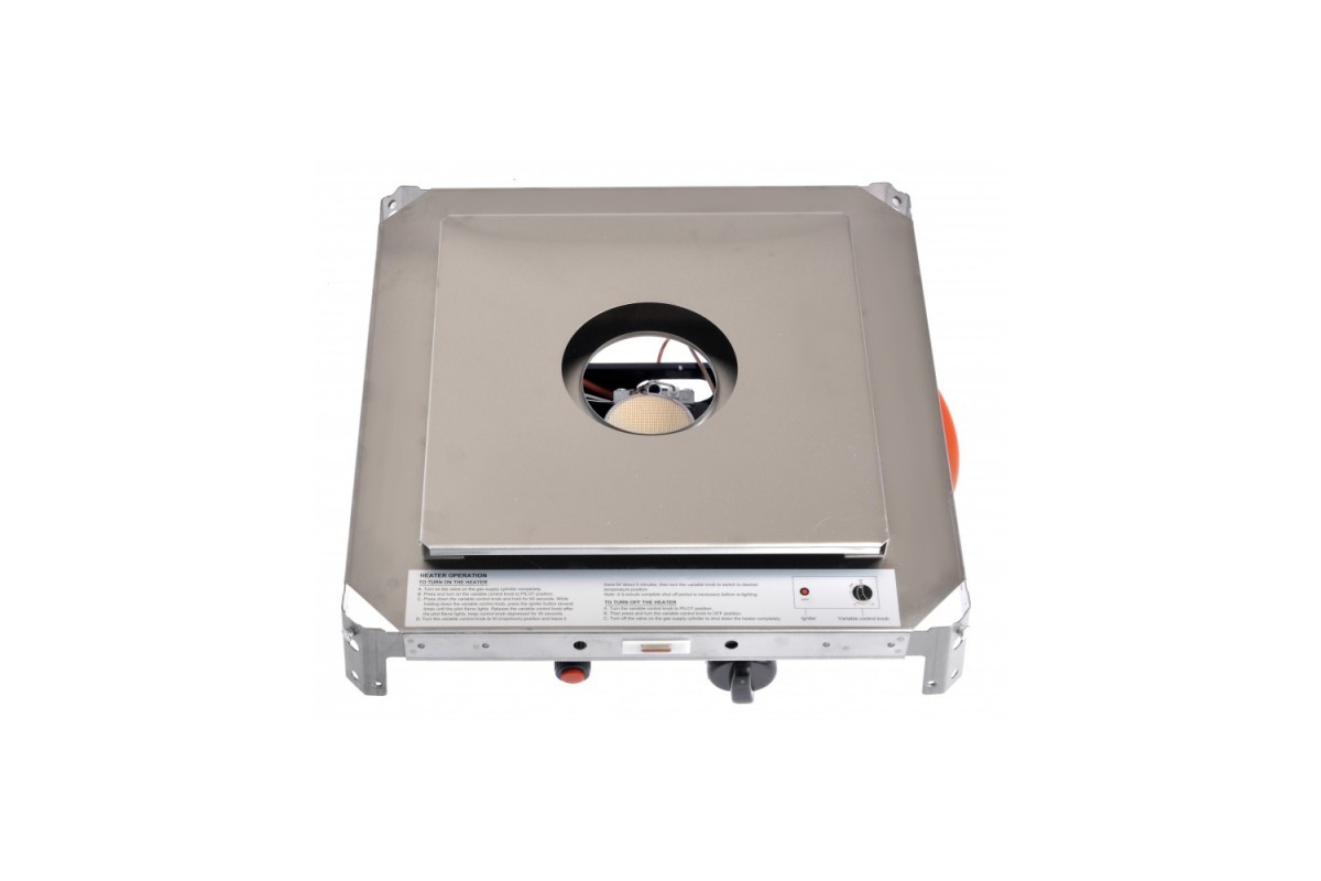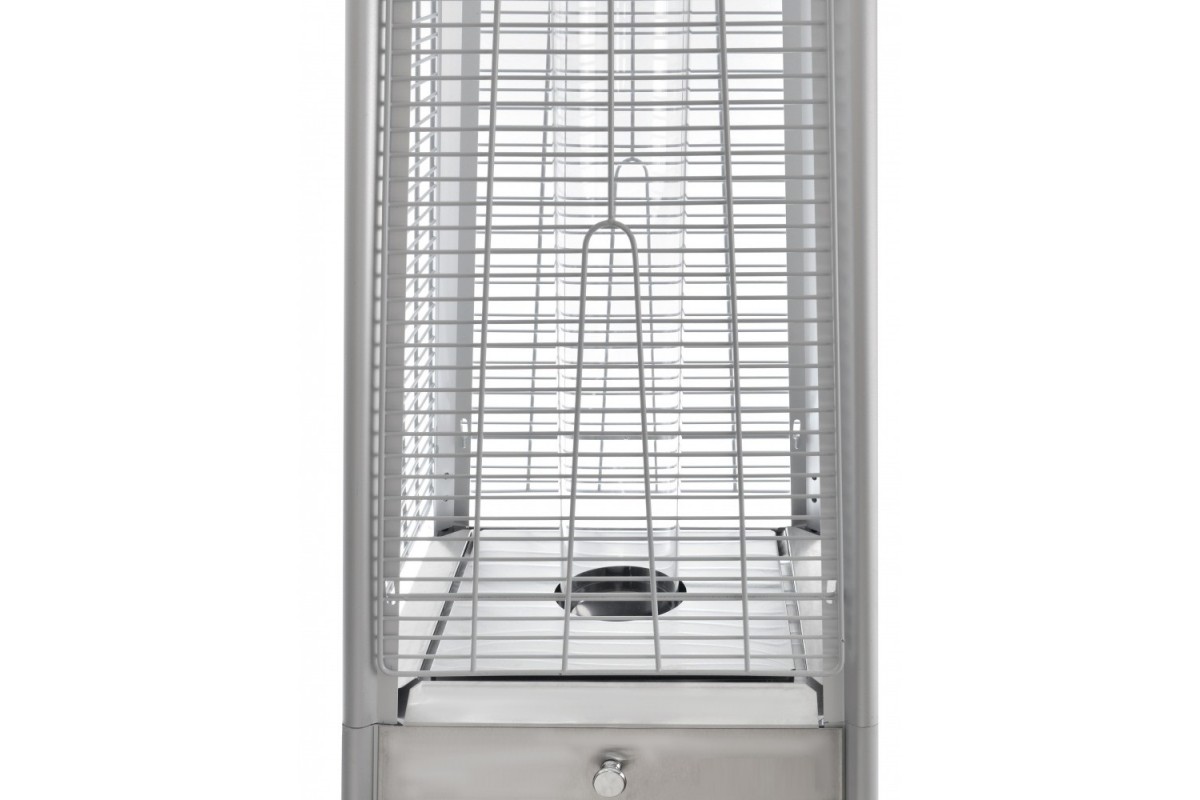 Закрытая нижняя часть обогревателя выполнена и высококачественной стали и покрыта порошковой краской. Верх прибора – это стальной каркас с гранями, заполненный металлическими фасадами с продольной перфорацией, что делает стенки практически прозрачными. Внутри этой части помещена колба из прочного закаленного термостойкого стекла, по которой от топливного баллона вверх поднимается сжиженный газ (пропан-бутан). При активировании электро-пьезоподжига газ загорается, и в колбе появляется живое пламя, источающее инфракрасное тепло и мягкий свет. Попадая на шляпку-редуктор, тепловые лучи рассеиваются в окружающее пространство, нагревая предметы.