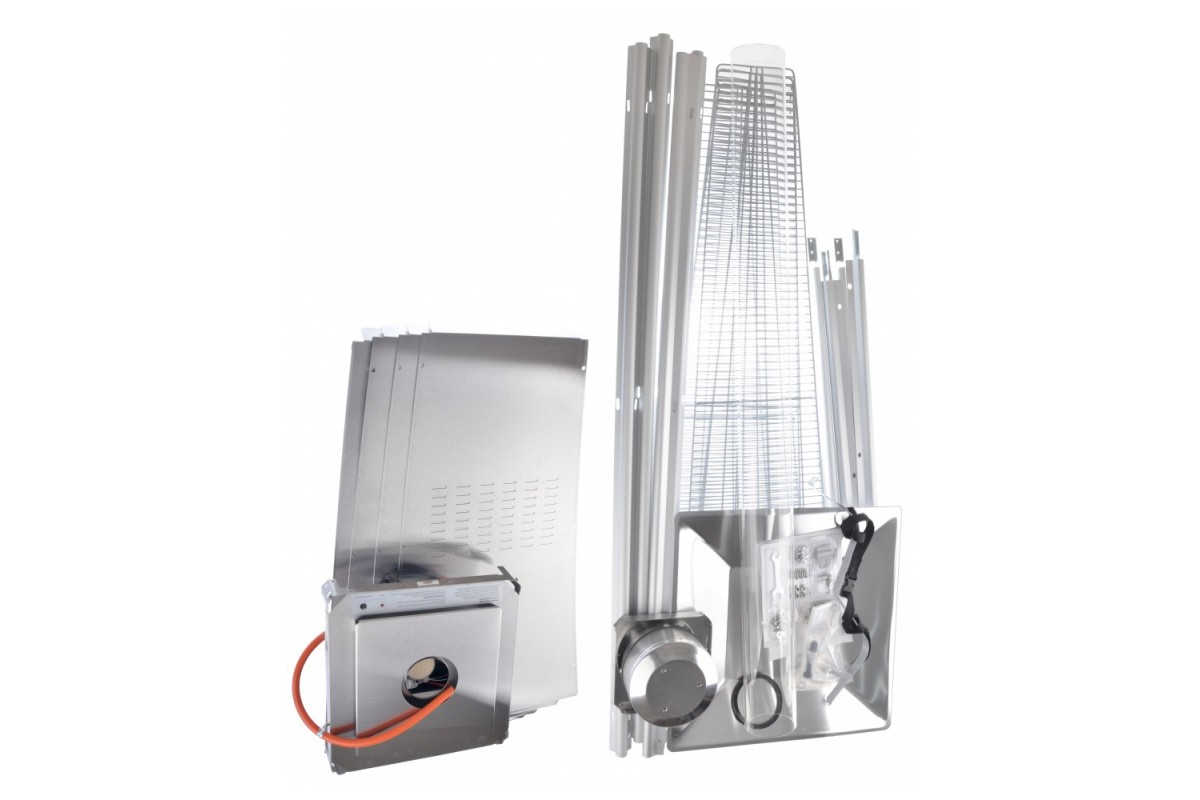 Уличный газовый обогреватель Ställeh Pyramid x4 представляет собой усеченную трехгранную пирамиду, на вершине которой установлена шляпка, выполняющая функцию рефлектора. Отражатель инфракрасных лучей изготовлен из цельного куска алюминия, что обеспечивает прибору надежность, долговечность, привлекательный вид и высокий КПД.