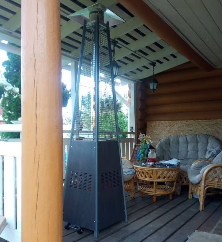 Благодаря пирамидальному корпусу этот обогреватель эффективно повышает температуру воздуха в диаметре пяти метров вокруг себя.