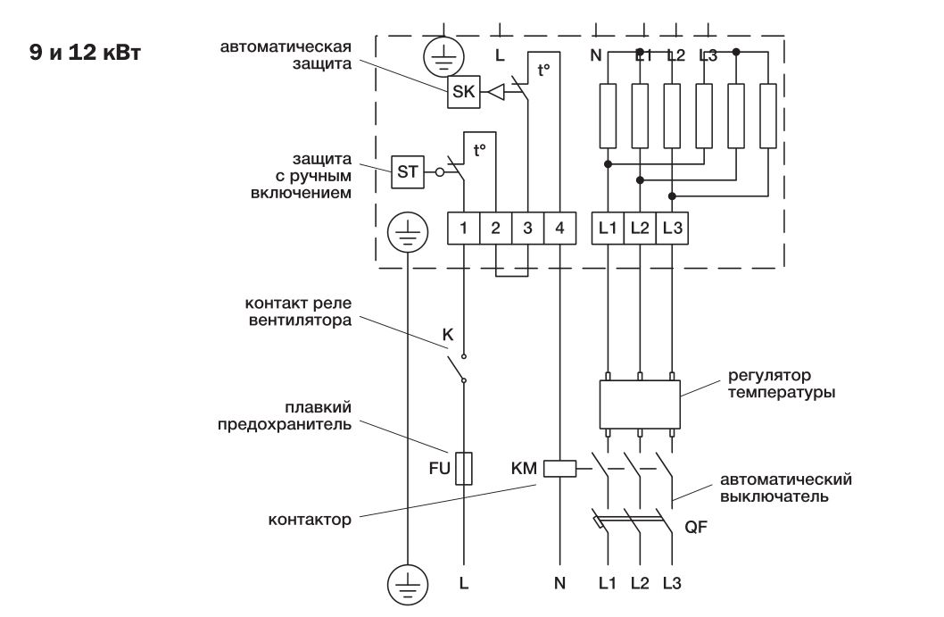 Нагреватель оборудован двухступенчатой защитой от перегрева. Реле первой ступени (с автоматическим возвратом в исходное положение) срабатывает, когда температура воздуха на выходе из нагревателя достигает 60 °С. Реле второй ступени (с ручным возвратом в исходное положение нажатием кнопки, расположенной на корпусе нагревателя) срабатывает при температуре 120 °С.