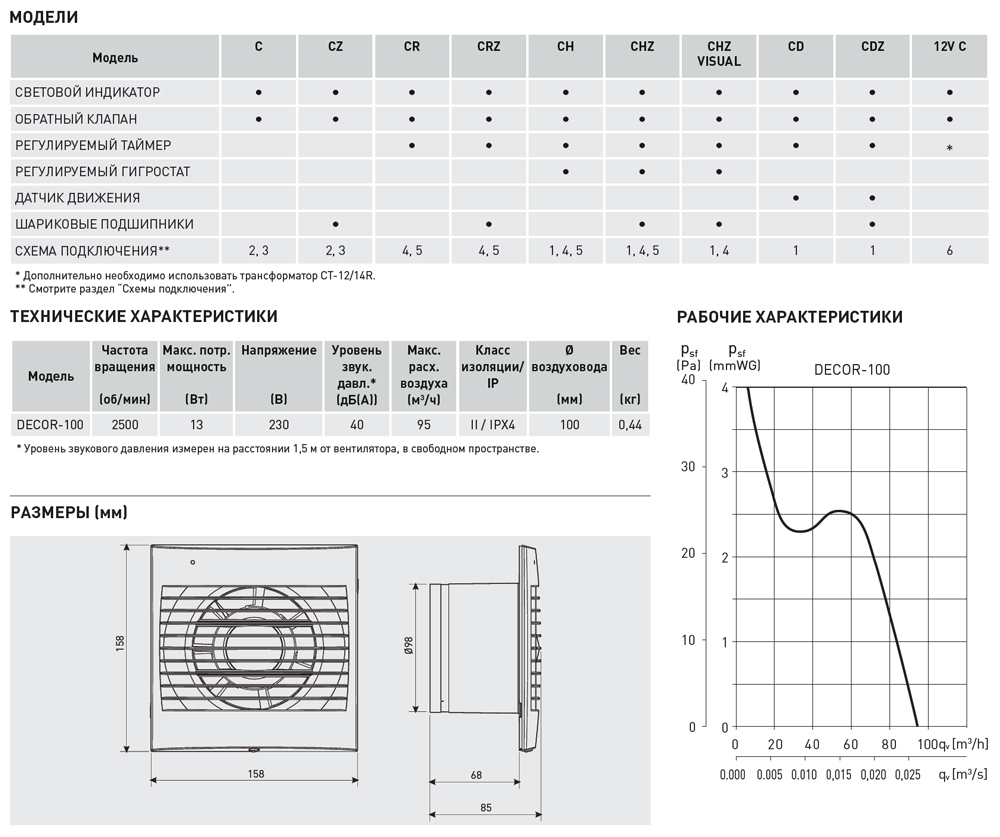 Максимальный расход воздуха составляет 100 м3/ч. Вентиляторы предназначены для присоединения к воздуховодам диаметром 100 мм.