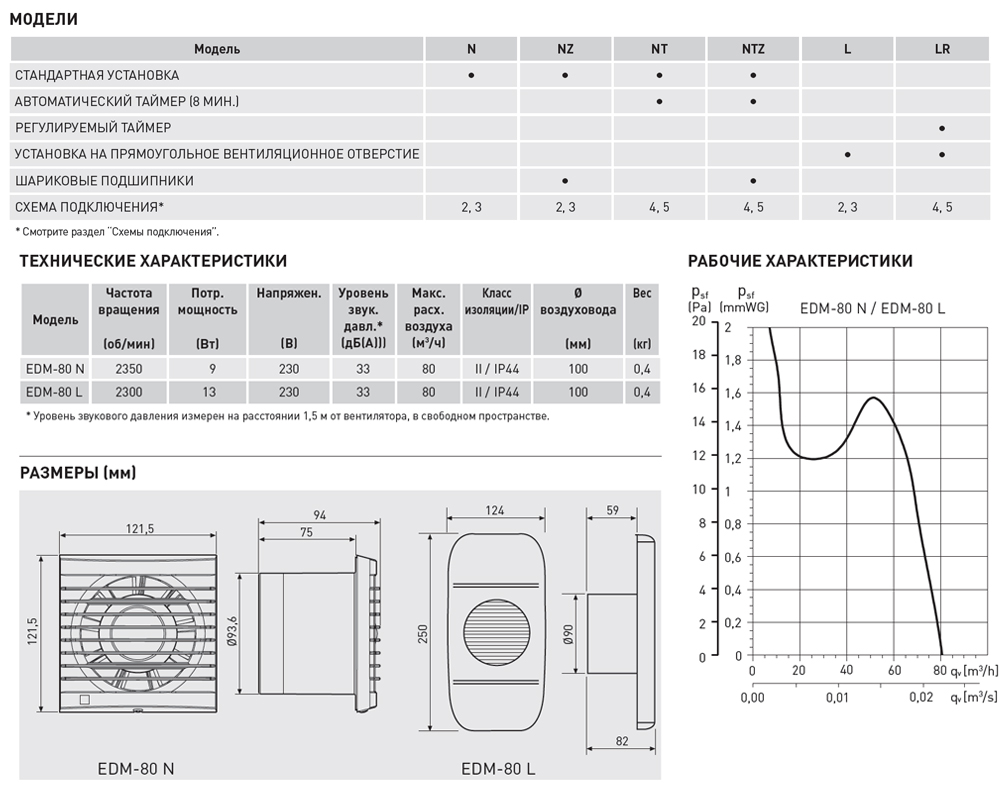 Вентиляторы имеют II класс электробезопасности, класс защиты IP 44 и рабочую температуру воздуха от 0°С до +40°С.