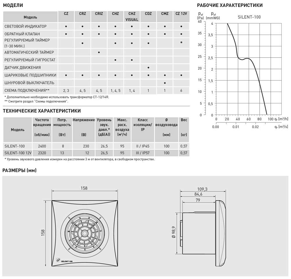 Вентиляторы предназначены для присоединения к воздуховодам диаметром 100 мм. Имеют II класс электробезопасности и не требуют заземления, класс защиты IP45 и рабочую температуру воздуха от 0°С до +40°С.