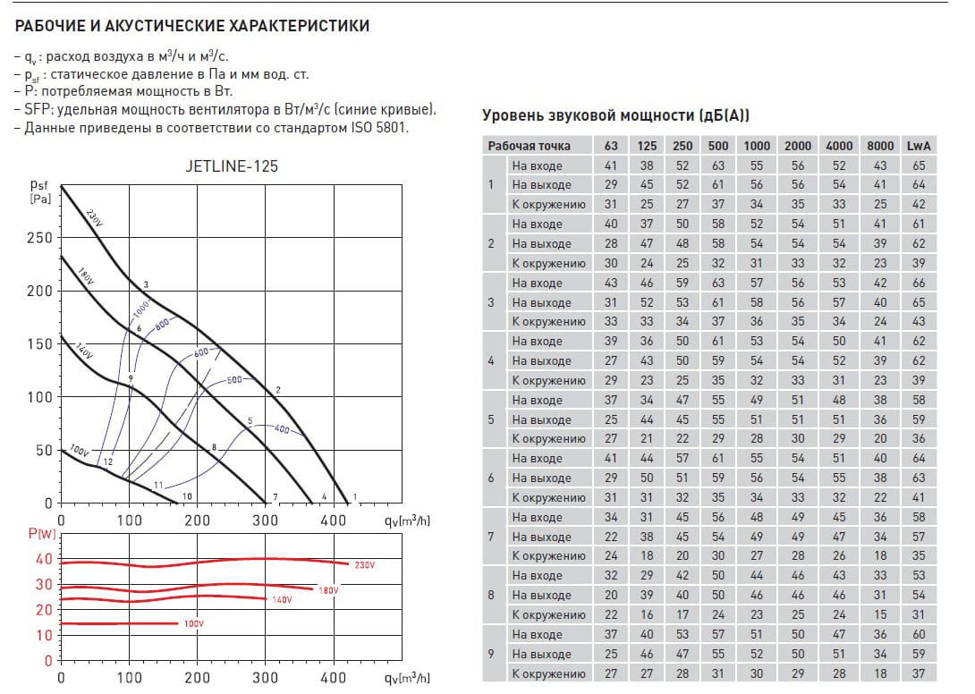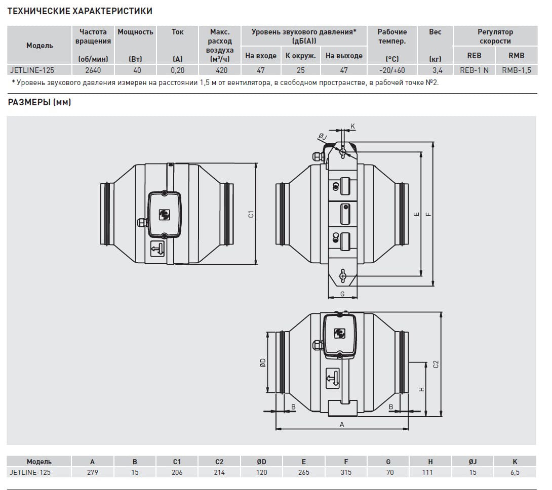 Вентиляторы JETLINE-125 имеют производительность 420 м3/ч. Параметры электропитания: 1ф – 230В – 50Гц. Вентиляторы имеют возможность регулирования скорости напряжением.