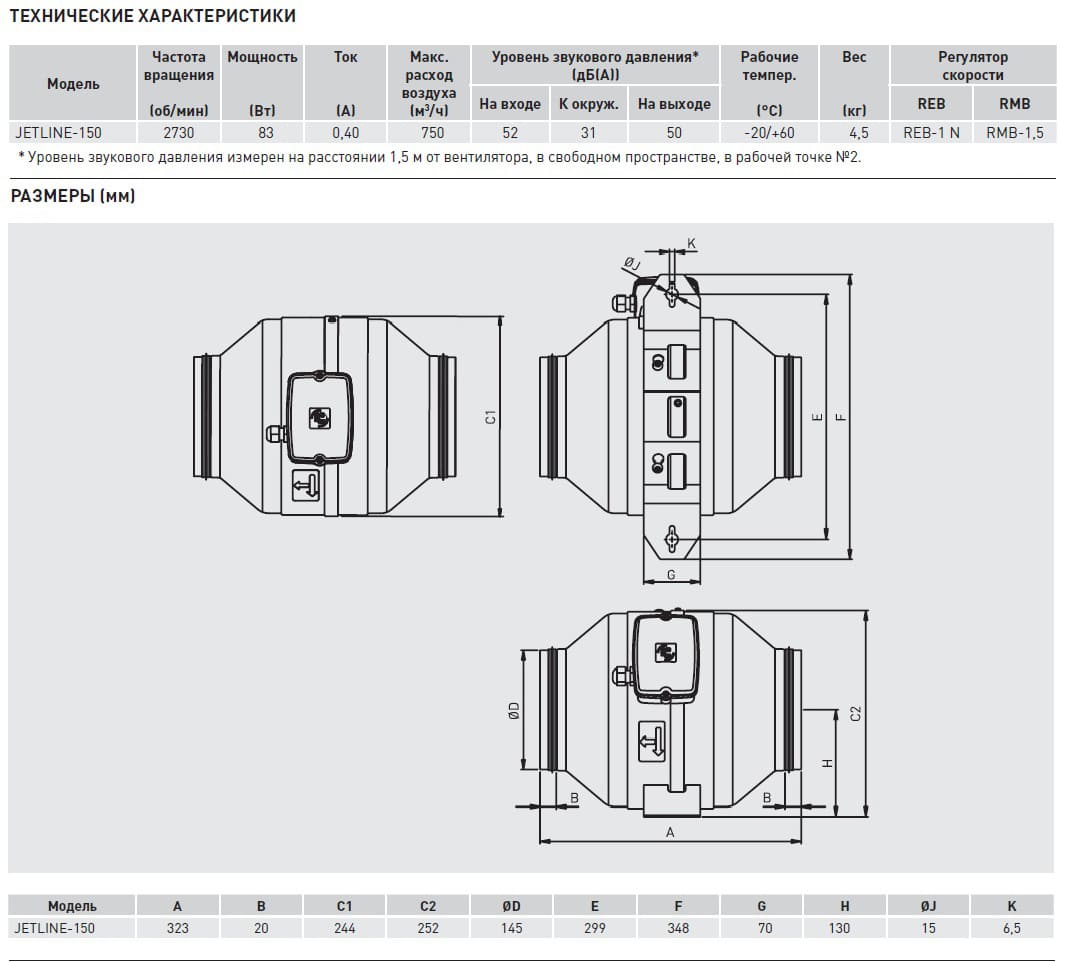 Вентиляторы JETLINE-150 имеют производительность 750 м3/ч. Параметры электропитания: 1ф – 230В – 50Гц. Вентиляторы имеют возможность регулирования скорости напряжением.