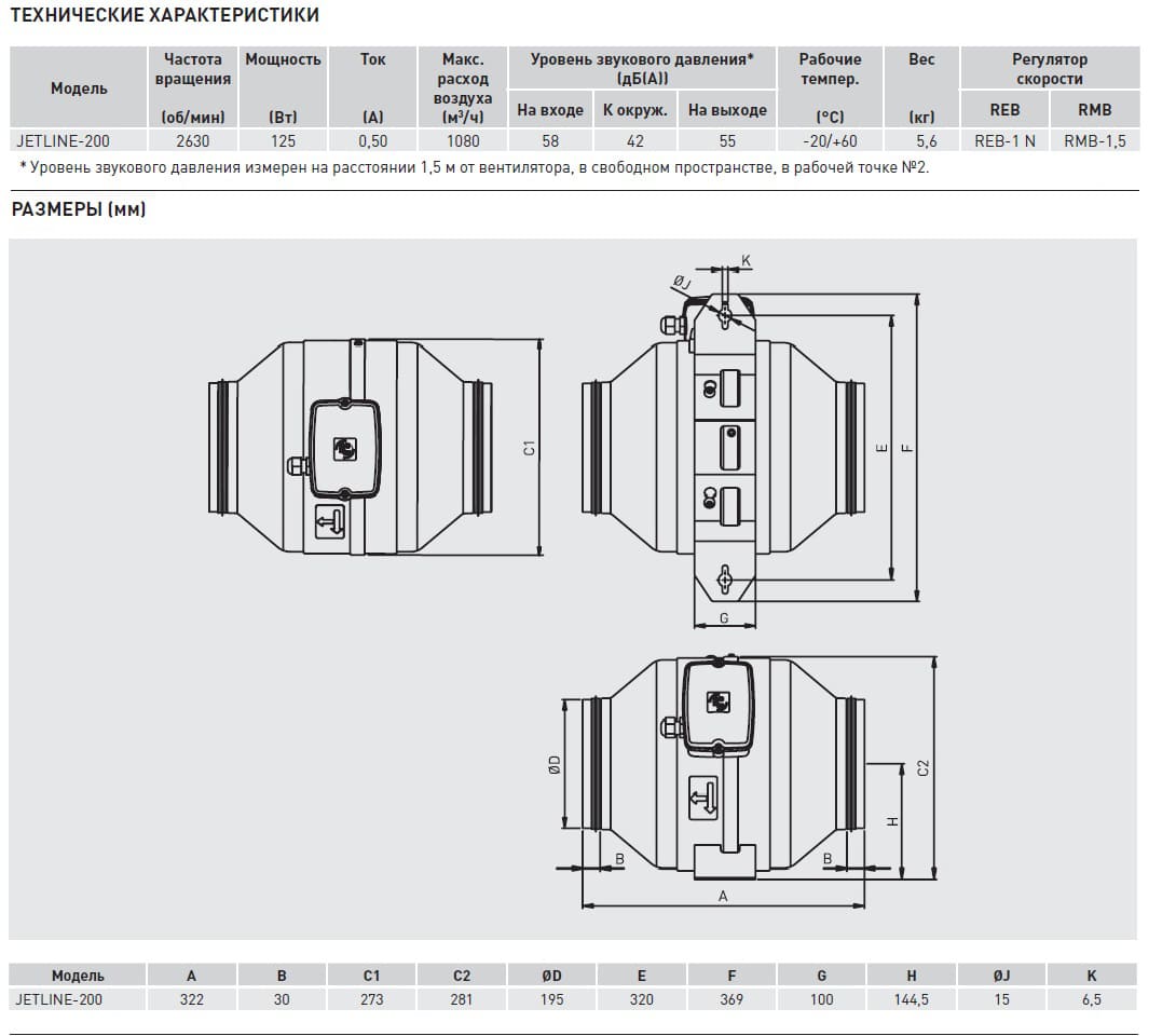 Вентиляторы JETLINE-200 имеют производительность 1080 м3/ч. Параметры электропитания: 1ф – 230В – 50Гц. Вентиляторы имеют возможность регулирования скорости напряжением.