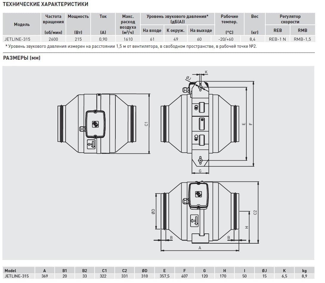 Вентиляторы JETLINE-315 имеют производительность 1610 м3/ч. Параметры электропитания: 1ф – 230В – 50Гц. Вентиляторы имеют возможность регулирования скорости напряжением.