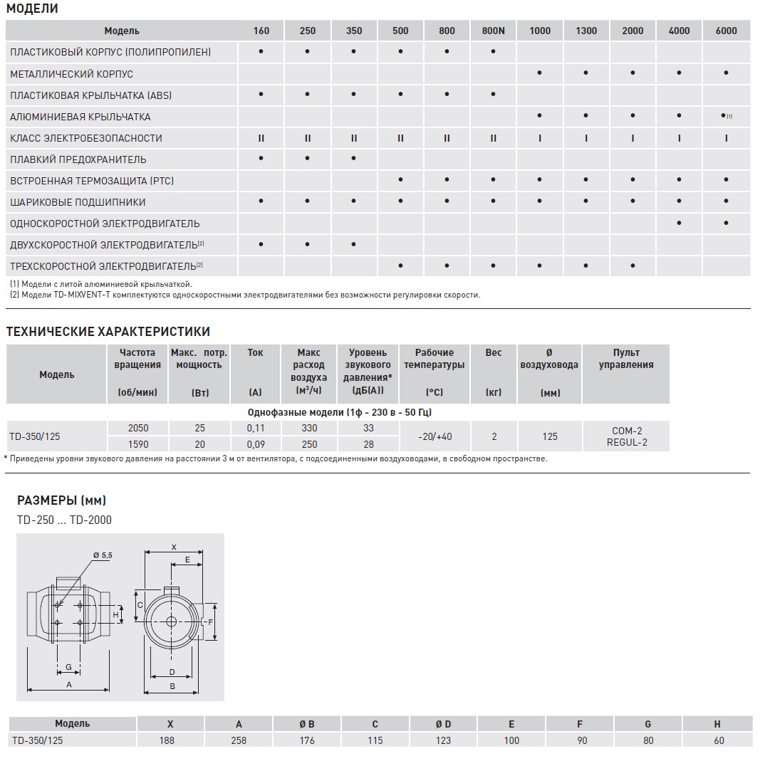 Вентиляторы TD-SILENT оснащаются однофазными двух или трехскоростными электродвигателями, с шариковыми подшипниками и встроенной защитой от перегрева.