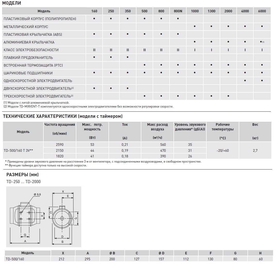 В зависимости от модели, вентиляторы TD- SILENT-T комплектуются одно или трехскоростными однофазными электродвигателями. У трехскоростных моделей функция таймера работает только на высокой скорости и дополнительная регулировка скорости невозможна.