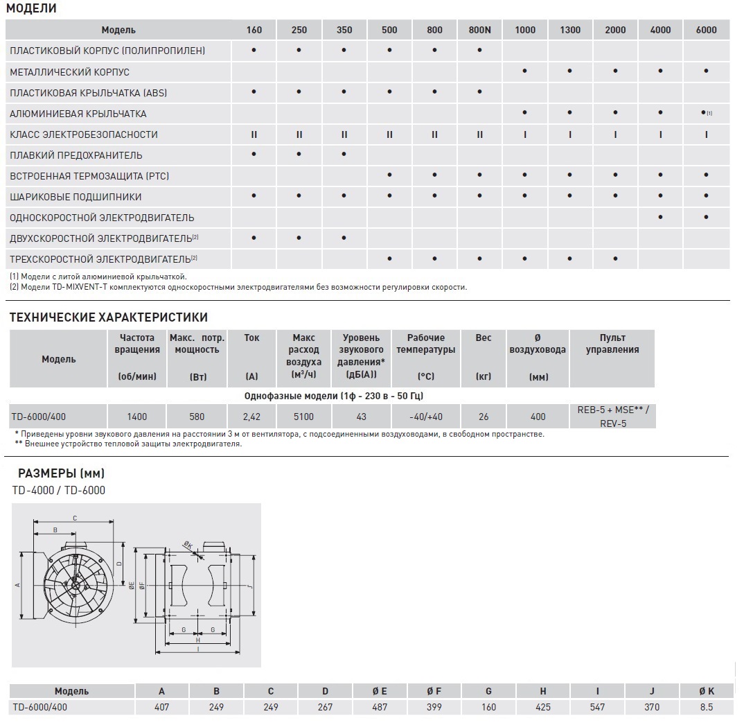 Модели 4000 и 6000: Класс защиты IP54, класс изоляции F, с шариковыми подшипниками. Параметры электропитания: 1ф - 230 В - 50 Гц, 3ф - 400 В - 50 ц. Трехфазные регулируют скорость вращения вентилятора при помощи автотрансформатора или преобразователя частоты. Вентилятор предназначен для использования в системах вентиляции и должен применяться в среде обычного, чистого воздуха, без каких-либо примесей. Не используйте данный вентилятор во взрывоопасной и коррозийной среде.