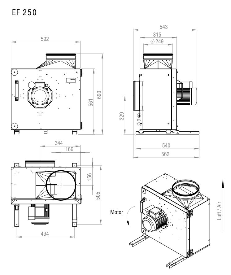 Кроме того, корпус вентилятора имеет специальную форму для сбора жира и слива, а также кронштейны для надежного монтажа. Возможны 3 положения патрубка, а конструкция корпуса позволяет организовать горизонтальный выброс воздуха.