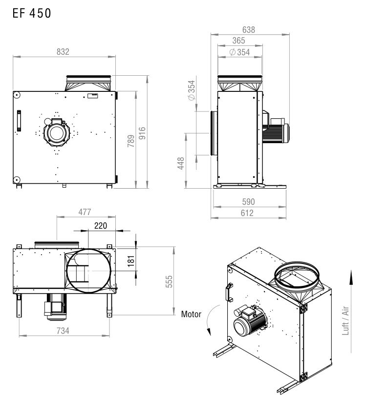 Кроме того, корпус вентилятора имеет специальную форму для сбора жира и слива, а также кронштейны для надежного монтажа. Возможны 3 положения патрубка, а конструкция корпуса позволяет организовать горизонтальный выброс воздуха.