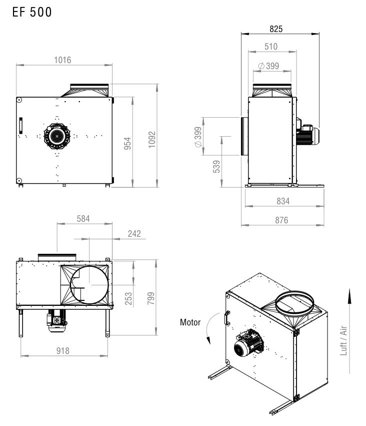 Кроме того, корпус вентилятора имеет специальную форму для сбора жира и слива, а также кронштейны для надежного монтажа. Возможны 3 положения патрубка, а конструкция корпуса позволяет организовать горизонтальный выброс воздуха.