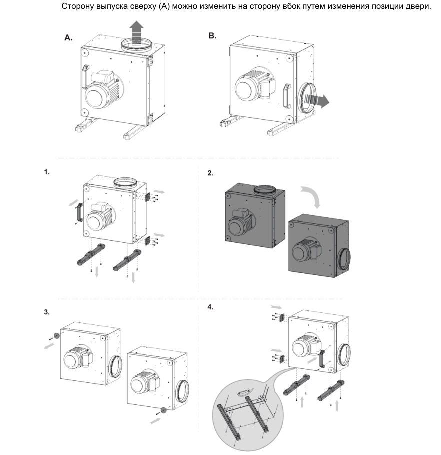 Кроме того, корпус вентилятора имеет специальную форму для сбора жира и слива, а также кронштейны для надежного монтажа. Возможны 3 положения патрубка, а конструкция корпуса позволяет организовать горизонтальный выброс воздуха.