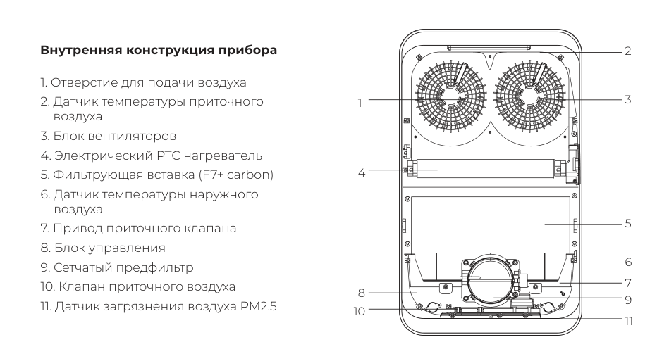- Функция подачи свежего воздуха с улицы в помещение малошумными вентиляторами;