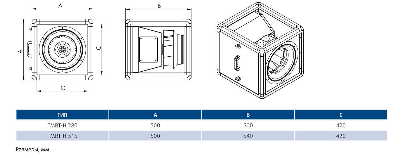 Sysimple TMBT-H выпускается с асинхронным электродвигателем, расположенным вне зоны потока воздуха. Двигатель вне зоны потока воздуха обеспечивает возможность работы в высокотемпературной среде. Возможно изменение направления потока воздуха вправо, влево, вверх в зависимости от потребности по месту. Лопатки рабочего колеса вентилятора обладают высокими аэродинамическими характеристиками благодаря чему обеспечивается равномерный поток воздуха. Рабочее колесо вентилятора TMBT-H — сварное, с назад загнутыми лопатками, подходит для работы на высоких оборотах. Легкое обслуживание вентилятора достигается благодаря наличию сервисной дверцы. Имеется дренажный вывод для отвода конденсата.
